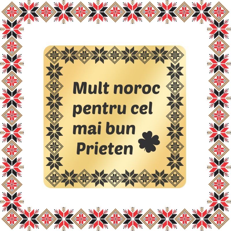 Martisor brosa personalizata - tablou cu motive traditionale pentru Prieten. Realizat din inox acoperit PVD cu aur si personalizat prin gravura laser cu rama cu motive si mesajul Mult noroc pentru cel mai bun Prieten! Daruieste martisoare deosebite, personalizate special pentru oamenii pe care ii iubesti, pe care ii admiri, celor carora vrei sa le multumesti si celor carora vrei sa le daruiesti un gand bun odata cu venirea primaverii! Opteaza pentru un martisor realizat din otel inoxidabil pentru ca primitoarea sa il poata purta tot anul.