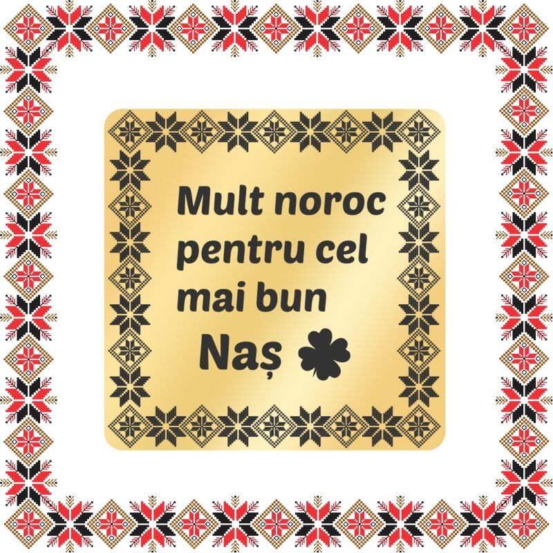 Martisor brosa personalizata - tablou cu motive traditionale pentru Nas. Realizat din inox acoperit PVD cu aur si personalizat prin gravura laser cu rama cu motive si mesajul Mult noroc pentru cel mai bun Nas! Opteaza pentru un martisor realizat din otel inoxidabil pentru ca primitoarea sa il poata purta tot anul.