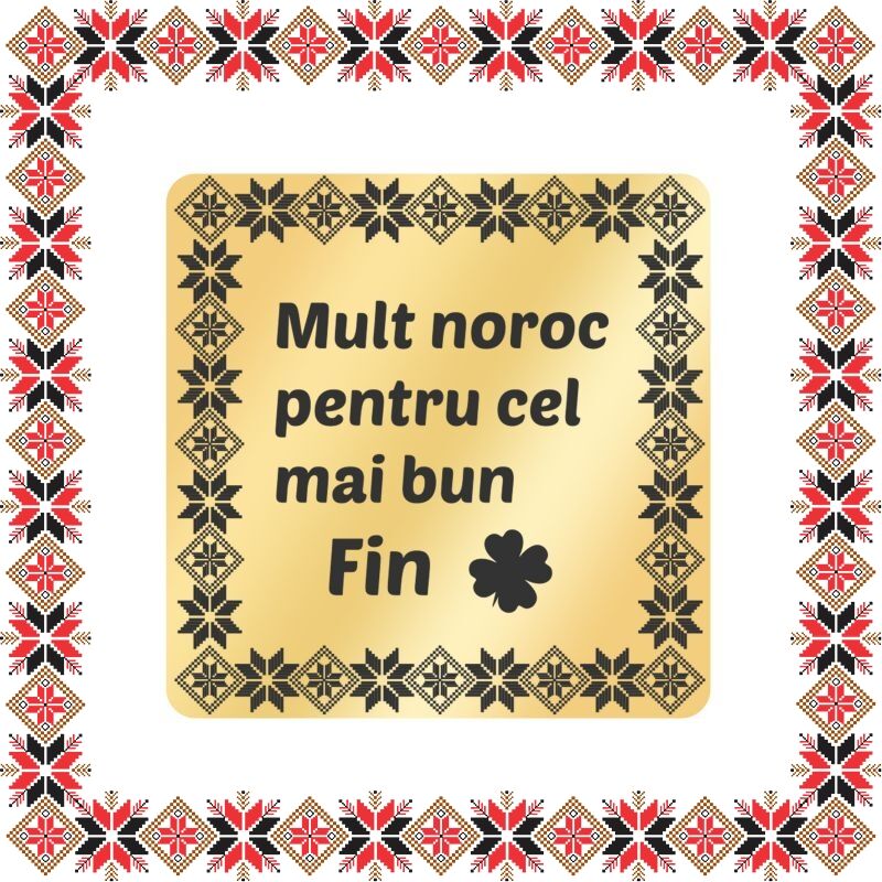 Martisor brosa personalizata - tablou cu motive traditionale pentru Fin. Realizat din inox acoperit PVD cu aur si personalizat prin gravura laser cu rama cu motive si mesajul Mult noroc pentru cel mai bun Fin! Opteaza pentru un martisor realizat din otel inoxidabil pentru ca primitoarea sa il poata purta tot anul.