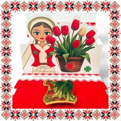 Martisor ambalat premium pe suport de carton tip felicitare 3D de culoare bej cu catifea rosie, tematica inspirata din folclor si stil prietenos, design traditional, stil modern.