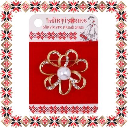 Brosa martisor in forma de floare accesorizata cu pietre multifatetate transparente si margeluta sidefata tip perla pe baza auriu mat realizata din metale comune. Daruieste primavara!