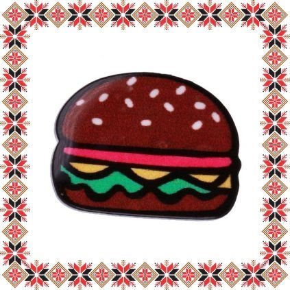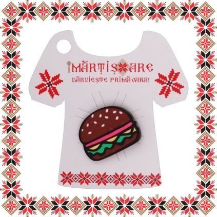 Brosa martisor in forma de hamburger in nuante de galben, maro, verde si rosu, realizata din plastic. Daruieste amuzament de martisor!