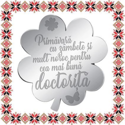 Brosa martisor in forma de trifoi cu patru foi din inox de culoare argintie, gravata cu trifoi, fluture si mesajul Primavara cu zambete si mult noroc pentru cea mai buna doctorita. Alege un martisor realizat din otel inoxidabil pentru ca primitoarea il va putea purta tot anul, fa-o sa zambeasca odata cu venirea primaverii!