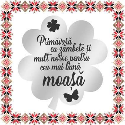 Brosa martisor in forma de trifoi cu patru foi din inox de culoare argintie, gravata cu trifoi, fluture si mesajul Primavara cu zambete si mult noroc pentru cea mai buna moasa. Alege un martisor realizat din otel inoxidabil pentru ca primitoarea il va putea purta tot anul, fa-o sa zambeasca odata cu venirea primaverii!