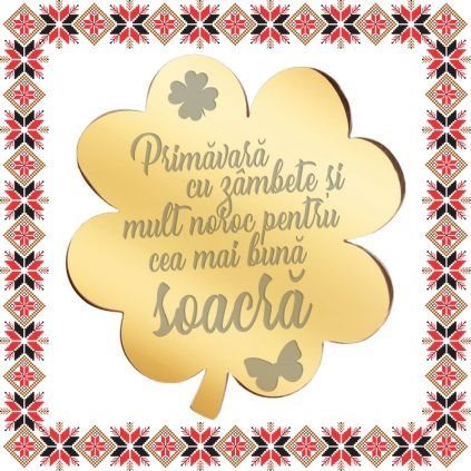 Brosa martisor in forma de trifoi cu patru foi din inox de culoare aurie, gravata cu trifoi, fluture si mesajul Primavara cu zambete si mult noroc pentru cea mai buna soacra. Alege un martisor realizat din otel inoxidabil pentru ca primitoarea il va putea purta tot anul. Alege modelul care i se potriveste si fa-o sa zambeasca odata cu venirea primaverii!