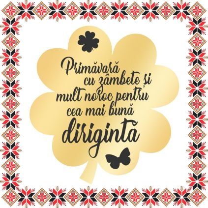 Brosa martisor in forma de trifoi cu patru foi din inox de culoare aurie, gravata cu trifoi, fluture si mesajul Primavara cu zambete si mult noroc pentru cea mai buna diriginta. Alege un martisor realizat din otel inoxidabil pentru ca primitoarea il va putea purta tot anul, fa-o sa zambeasca odata cu venirea primaverii!