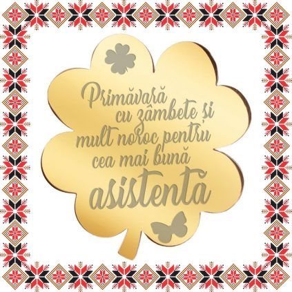 Brosa martisor in forma de trifoi cu patru foi din inox de culoare aurie, gravata cu trifoi, fluture si mesajul Primavara cu zambete si mult noroc pentru cea mai buna asistenta. Alege un martisor realizat din otel inoxidabil pentru ca primitoarea il va putea purta tot anul, fa-o sa zambeasca odata cu venirea primaverii!