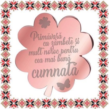 Brosa martisor in forma de trifoi cu patru foi din inox de culoare rose gold, gravata cu trifoi, fluture si mesajul Primavara cu zambete si mult noroc pentru cea mai buna cumnata. Alege un martisor realizat din otel inoxidabil pentru ca primitoarea il va putea purta tot anul, fa-o sa zambeasca odata cu venirea primaverii!