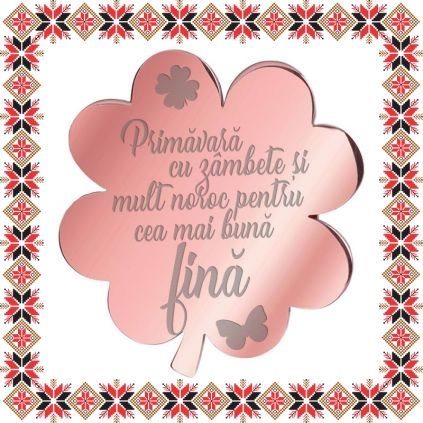 Brosa martisor in forma de trifoi cu patru foi din inox de culoare rose gold, gravata cu trifoi, fluture si mesajul Primavara cu zambete si mult noroc pentru cea mai buna fina. Alege un martisor realizat din otel inoxidabil pentru ca primitoarea il va putea purta tot anul. Alege modelul care i se potriveste si fa-o sa zambeasca odata cu venirea primaverii!