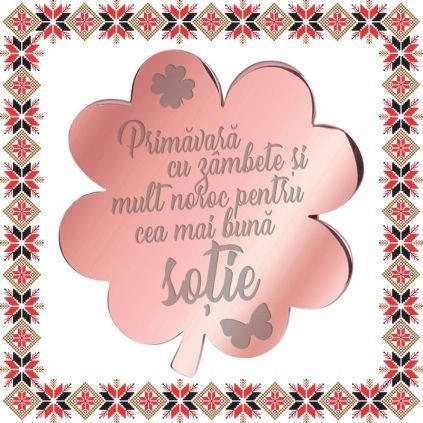 Brosa martisor in forma de trifoi cu patru foi din inox de culoare rose gold, gravata cu trifoi, fluture si mesajul Primavara cu zambete si mult noroc pentru cea mai buna sotie. Alege un martisor realizat din otel inoxidabil pentru ca primitoarea il va putea purta tot anul, fa-o sa zambeasca odata cu venirea primaverii!