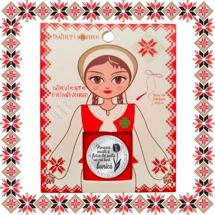 Martisor ambalat pe suport de carton cu catifea rosie si plic de carton cu motive traditionale romanesti. Martisorul este insotit de plic de hartie imprimat cu motive traditionale romanesti si snur de martisor. Deasemenea veti primi alaturi de martisor bucuria cu care noi l-am creat, tot ce trebuie sa faceti este sa adaugati bucuria daruirii si sa il oferiti persoanei dragi impreuna cu primavara.