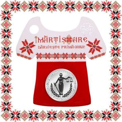 Martisor ambalat pe suport de carton in forma de ie romaneasca cu catifea rosie si motive traditionale romanesti. Martisorul este insotit de plic de hartie imprimat cu motive traditionale romanesti si snur de martisor. Deasemenea veti primi alaturi de martisor bucuria cu care noi l-am creat, tot ce trebuie sa faceti este sa adaugati bucuria daruirii si sa il oferiti persoanei dragi impreuna cu primavara.