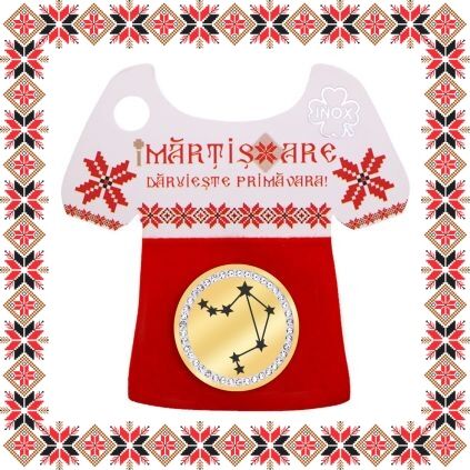 Martisor ambalat pe suport de carton in forma de ie romaneasca cu catifea rosie si motive traditionale romanesti. Martisorul este insotit de plic de hartie imprimat cu motive traditionale romanesti si snur de martisor. Deasemenea veti primi alaturi de martisor bucuria cu care noi l-am creat, tot ce trebuie sa faceti este sa adaugati bucuria daruirii si sa il oferiti persoanei dragi impreuna cu primavara.