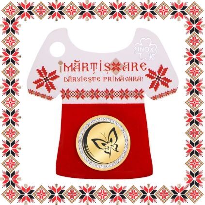 Martisor ambalat pe suport de carton in forma de ie romaneasca cu catifea rosie si motive traditionale romanesti. Martisorul este insotit de plic de hartie imprimat cu motive traditionale romanesti si snur de martisor. Deasemenea veti primi alaturi de martisor bucuria cu care noi l-am creat, tot ce trebuie sa faceti este sa adaugati bucuria daruirii si sa il oferiti persoanei dragi impreuna cu primavara.