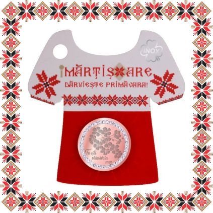 Martisor ambalat pe suport de carton in forma de ie romaneasca cu catifea rosie si motive traditionale romanesti. Martisorul este insotit de plic de hartie imprimat cu motive traditionale romanesti si snur de martisor. Deasemenea veti primi alaturi de martisor bucuria cu care noi l-am creat, tot ce trebuie sa faceti este sa adaugati bucuria daruirii si sa il oferiti persoanei dragi impreuna cu primavara.