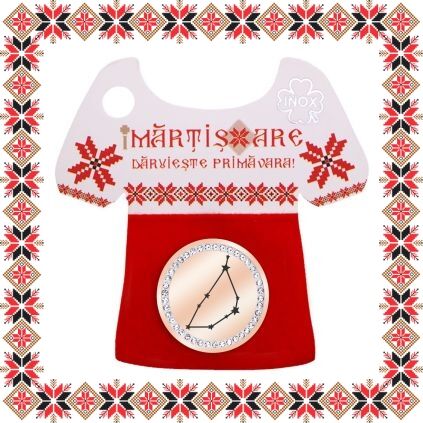 Martisor ambalat pe suport de carton in forma de ie romaneasca cu catifea rosie si motive traditionale romanesti. Martisorul este insotit de plic de hartie imprimat cu motive traditionale romanesti si snur de martisor. Deasemenea veti primi alaturi de martisor bucuria cu care noi l-am creat, tot ce trebuie sa faceti este sa adaugati bucuria daruirii si sa il oferiti persoanei dragi impreuna cu primavara.