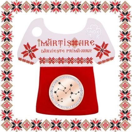 Martisor ambalat pe suport de carton in forma de ie romaneasca cu catifea rosie si motive traditionale romanesti. Martisorul este insotit de plic de hartie imprimat cu motive traditionale romanesti si snur de martisor. Deasemenea veti primi alaturi de martisor bucuria cu care noi l-am creat, tot ce trebuie sa faceti este sa adaugati bucuria daruirii si sa il oferiti persoanei dragi impreuna cu primavara.