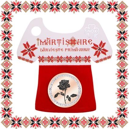 Martisor ambalat pe suport de carton in forma de ie romaneasca cu catifea rosie si motive traditionale romanesti. Martisorul este insotit de plic de hartie imprimat cu motive traditionale romanesti si snur de martisor. Deasemenea veti primi alaturi de martisor bucuria cu care noi l-am creat, tot ce trebuie sa faceti este sa adaugati bucuria daruirii si sa il oferiti persoanei dragi impreuna cu primavara.