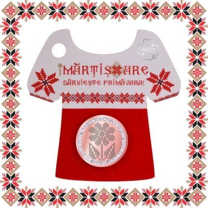 Martisor ambalat pe suport de carton in forma de ie romaneasca cu catifea rosie si motive traditionale romanesti. Martisorul este insotit de plic de hartie imprimat cu motive traditionale romanesti si snur de martisor. Deasemenea veti primi alaturi de martisor bucuria cu care noi l-am creat, tot ce trebuie sa faceti este sa adaugati bucuria daruirii si sa il oferiti persoanei dragi impreuna cu primavara.