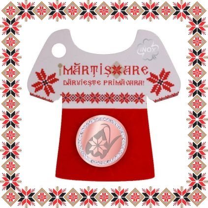 Martisor ambalat pe suport de carton in forma de ie romaneasca cu catifea rosie si motive traditionale romanesti. Martisorul este insotit de plic de hartie imprimat cu motive traditionale romanesti si snur de martisor. Deasemenea veti primi alaturi de martisor bucuria cu care noi l-am creat, tot ce trebuie sa faceti este sa adaugati bucuria daruirii si sa il oferiti persoanei dragi impreuna cu primavara.