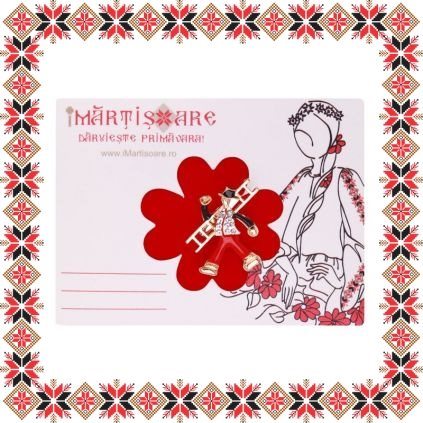 Martisor ambalat in plic de carton de culoare bej cu desen doamna Primavara cu motive traditionale romanesti si buretel cu catifea rosie. Plicul este inscriptionat cu urarea Daruieste Primavara si perforatie trifoi! Ambalaj prevazut cu spatiu pentru a scrie o urare sau numele persoanei care va primi martisorul.