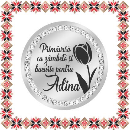 Brosa gravata cu floare lalea si mesajul Primavara cu zambete si bucurie pentru Adina! Brosa martisor banut din inox de culoare argintie cu pietricele multifatetate transparente. Daruieste martisoare personalizate! Alege un martisor realizat din otel inoxidabil pentru ca primitoarea il va putea purta tot anul. Alege modelul care sa ii poarte numele si fa-o sa zambeasca odata cu venirea primaverii!