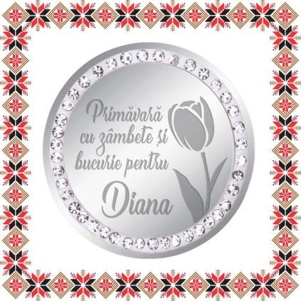 Brosa gravata cu floare lalea si mesajul Primavara cu zambete si bucurie pentru Diana! Brosa martisor banut din inox de culoare argintie cu pietricele multifatetate transparente. Daruieste martisoare personalizate! Alege un martisor realizat din otel inoxidabil pentru ca primitoarea il va putea purta tot anul. Alege modelul care sa ii poarte numele si fa-o sa zambeasca odata cu venirea primaverii!