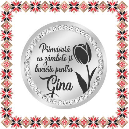 Brosa gravata cu floare lalea si mesajul Primavara cu zambete si bucurie pentru Gina! Brosa martisor banut din inox de culoare argintie cu pietricele multifatetate transparente. Daruieste martisoare personalizate! Alege un martisor realizat din otel inoxidabil pentru ca primitoarea il va putea purta tot anul. Alege modelul care sa ii poarte numele si fa-o sa zambeasca odata cu venirea primaverii!