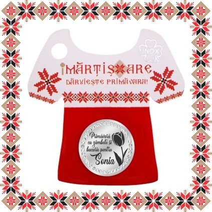 Martisor ambalat pe suport de carton in forma de ie romaneasca cu catifea rosie si motive traditionale romanesti. Martisorul este insotit de plic de hartie imprimat cu motive traditionale romanesti si snur de martisor. Deasemenea veti primi alaturi de martisor bucuria cu care noi l-am creat, tot ce trebuie sa faceti este sa adaugati bucuria daruirii si sa il oferiti persoanei dragi impreuna cu primavara.