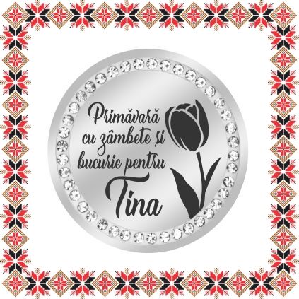 Brosa gravata cu floare lalea si mesajul Primavara cu zambete si bucurie pentru Tina! Brosa martisor banut din inox de culoare argintie cu pietricele multifatetate transparente. Daruieste martisoare personalizate! Alege un martisor realizat din otel inoxidabil pentru ca primitoarea il va putea purta tot anul, fa-o sa zambeasca odata cu venirea primaverii!