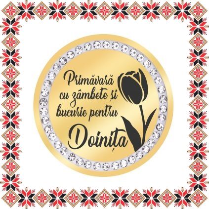 Brosa gravata cu floare lalea si mesajul Primavara cu zambete si bucurie pentru Doinita! Brosa martisor banut din inox de culoare aurie cu pietricele multifatetate transparente. Daruieste martisoare personalizate! Alege un martisor realizat din otel inoxidabil pentru ca primitoarea il va putea purta tot anul. Alege modelul care sa ii poarte numele si fa-o sa zambeasca odata cu venirea primaverii!