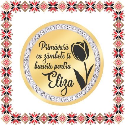 Brosa gravata cu floare lalea si mesajul Primavara cu zambete si bucurie pentru Eliza! Brosa martisor banut din inox de culoare aurie cu pietricele multifatetate transparente. Daruieste martisoare personalizate! Alege un martisor realizat din otel inoxidabil pentru ca primitoarea il va putea purta tot anul. Alege modelul care sa ii poarte numele si fa-o sa zambeasca odata cu venirea primaverii!