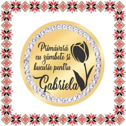 Brosa gravata cu floare lalea si mesajul Primavara cu zambete si bucurie pentru Gabriela! Brosa martisor banut din inox de culoare aurie cu pietricele multifatetate transparente. Daruieste martisoare personalizate! Alege un martisor realizat din otel inoxidabil pentru ca primitoarea il va putea purta tot anul. Alege modelul care sa ii poarte numele si fa-o sa zambeasca odata cu venirea primaverii!