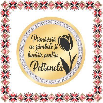 Brosa gravata cu floare lalea si mesajul Primavara cu zambete si bucurie pentru Petronela! Brosa martisor banut din inox de culoare aurie cu pietricele multifatetate transparente. Daruieste martisoare personalizate! Alege un martisor realizat din otel inoxidabil pentru ca primitoarea il va putea purta tot anul. Alege modelul care sa ii poarte numele si fa-o sa zambeasca odata cu venirea primaverii!