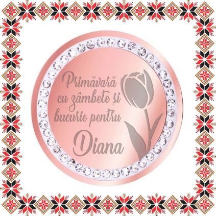 Brosa gravata cu floare lalea si mesajul Primavara cu zambete si bucurie pentru Diana ! Brosa martisor banut din inox de culoare rose gold cu pietricele multifatetate transparente. Daruieste martisoare personalizate! Alege un martisor realizat din otel inoxidabil pentru ca primitoarea il va putea purta tot anul, fa-o sa zambeasca odata cu venirea primaverii!