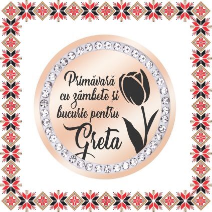 Brosa gravata cu floare lalea si mesajul Primavara cu zambete si bucurie pentru Greta ! Brosa martisor banut din inox de culoare rose gold cu pietricele multifatetate transparente. Daruieste martisoare personalizate! Alege un martisor realizat din otel inoxidabil pentru ca primitoarea il va putea purta tot anul. Alege modelul care sa ii poarte numele si fa-o sa zambeasca odata cu venirea primaverii!