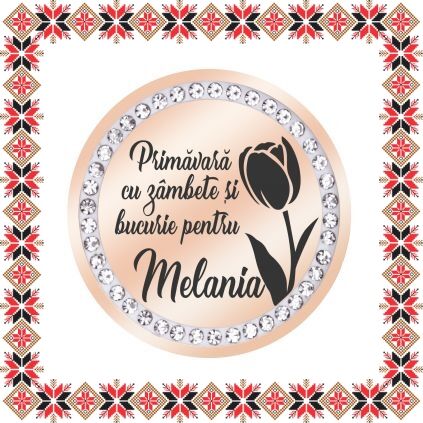 Brosa gravata cu floare lalea si mesajul Primavara cu zambete si bucurie pentru Melania ! Brosa martisor banut din inox de culoare rose gold cu pietricele multifatetate transparente. Daruieste martisoare personalizate! Alege un martisor realizat din otel inoxidabil pentru ca primitoarea il va putea purta tot anul. Alege modelul care sa ii poarte numele si fa-o sa zambeasca odata cu venirea primaverii!