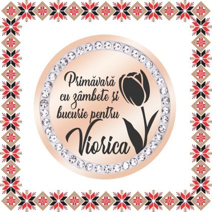 Brosa gravata cu floare lalea si mesajul Primavara cu zambete si bucurie pentru Viorica ! Brosa martisor banut din inox de culoare rose gold cu pietricele multifatetate transparente. Daruieste martisoare personalizate! Alege un martisor realizat din otel inoxidabil pentru ca primitoarea il va putea purta tot anul. Alege modelul care sa ii poarte numele si fa-o sa zambeasca odata cu venirea primaverii!