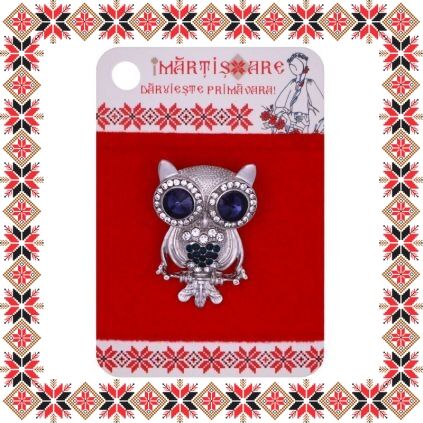 Brosa martisor in forma de bufnita simpatica cu pietricele multifatetate transparente si albastre pe baza argintie realizata din metale comune. Daruieste simbolul intelepciunii de martisor!