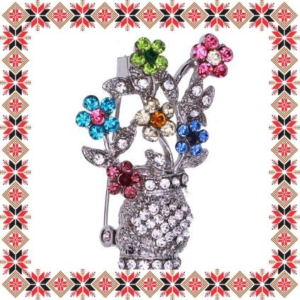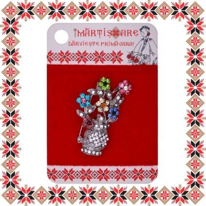 Brosa martisor in forma de buchet de flori in vaza cu pietricele multifatetate de diferite culori pe baza argintie realizata din metale comune. Daruieste flori de martisor!