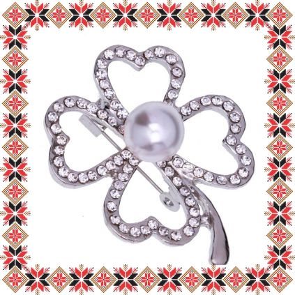 Brosa martisor in forma de trifoi cu patru foi contur cu pietricele multifatetate transparente si margeluta sidefata tip perla pe baza argintie realizata din metale comune. Daruieste noroc de martisor!