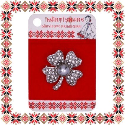 Brosa martisor in forma de trifoi cu patru foi cu pietricele multifatetate transparente si margeluta sidefata tip perla pe baza argintie realizata din metale comune. Daruieste noroc de martisor!