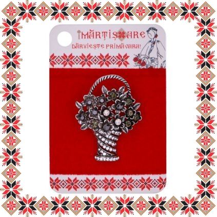 Brosa martisor in forma de cosulet cu flori cu pietricele multifatetate gri, negre si cu reflexii multicolore pe baza argintie realizata din metale comune. Daruieste flori de martisor!