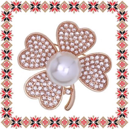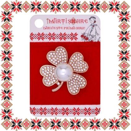 Brosa martisor in forma de trifoi cu patru foi elegant cu pietricele multifatetate transparente si margeluta sidefata tip perla supradimensionata pe baza aurie realizata din metale comune. Daruieste noroc de martisor!