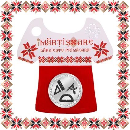 Martisor ambalat pe suport de carton in forma de ie romaneasca cu catifea rosie si motive traditionale romanesti. Martisorul este insotit de plic de hartie imprimat cu motive traditionale romanesti si snur de martisor. Deasemenea veti primi alaturi de martisor bucuria cu care noi l-am creat, tot ce trebuie sa faceti este sa adaugati bucuria daruirii si sa il oferiti persoanei dragi impreuna cu primavara.