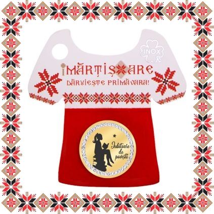 Martisor ambalat pe suport de carton in forma de ie romaneasca cu catifea rosie si motive traditionale romanesti. Martisorul este insotit de plic de hartie imprimat cu motive traditionale romanesti si snur de martisor. Deasemenea veti primi alaturi de martisor bucuria cu care noi l-am creat, tot ce trebuie sa faceti este sa adaugati bucuria daruirii si sa il oferiti persoanei dragi impreuna cu primavara.