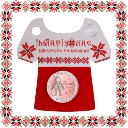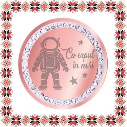 Brosa gravata cu un astronaut intre stele si mesajul Cu capul in nori. Martisorul ideal pentru doamnele care poarta stele in par si viseaza cu ochii deschisi. Brosa martisor banut din inox de culoare rose gold cu pietricele multifatetate transparente. Alege un martisor realizat din otel inoxidabil pentru ca primitoarea il va putea purta tot anul. Alege modelul care i se potriveste si fa-o sa zambeasca odata cu venirea primaverii!