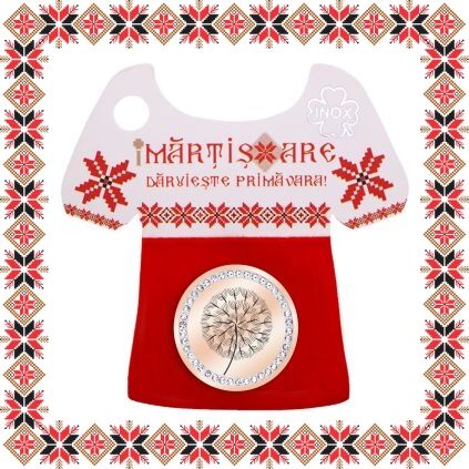 Martisor ambalat pe suport de carton in forma de ie romaneasca cu catifea rosie si motive traditionale romanesti. Martisorul este insotit de plic de hartie imprimat cu motive traditionale romanesti si snur de martisor. Deasemenea veti primi alaturi de martisor bucuria cu care noi l-am creat, tot ce trebuie sa faceti este sa adaugati bucuria daruirii si sa il oferiti persoanei dragi impreuna cu primavara.