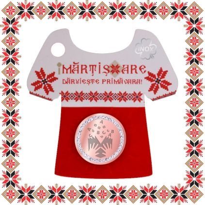 Martisor ambalat pe suport de carton in forma de ie romaneasca cu catifea rosie si motive traditionale romanesti. Martisorul este insotit de plic de hartie imprimat cu motive traditionale romanesti si snur de martisor. Deasemenea veti primi alaturi de martisor bucuria cu care noi l-am creat, tot ce trebuie sa faceti este sa adaugati bucuria daruirii si sa il oferiti persoanei dragi impreuna cu primavara.