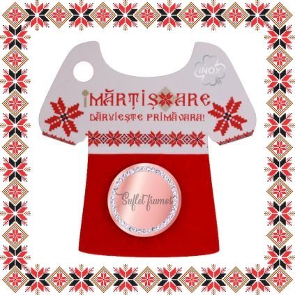 Martisor ambalat pe suport de carton in forma de ie romaneasca cu catifea rosie si motive traditionale romanesti. Martisorul este insotit de plic de hartie imprimat cu motive traditionale romanesti si snur de martisor. Deasemenea veti primi alaturi de martisor bucuria cu care noi l-am creat, tot ce trebuie sa faceti este sa adaugati bucuria daruirii si sa il oferiti persoanei dragi impreuna cu primavara.